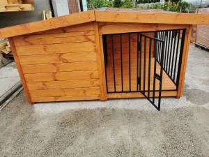 A kutyaház és a terasz belmagasságát 10 cm-rel megemeltük az alapmodellekhez képest, így a nagyobb kutyák is kényelmesen elférnek. A fedett terasz alapterülete pedig megegyezik a ház méretével – ez különösen kényelmessé teszi a használatát.