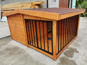 A kutyaház és a terasz belmagasságát 10 cm-rel megemeltük az alapmodellekhez képest, így a nagyobb kutyák is kényelmesen elférnek. A fedett terasz alapterülete pedig megegyezik a ház méretével – ez különösen kényelmessé teszi a használatát.