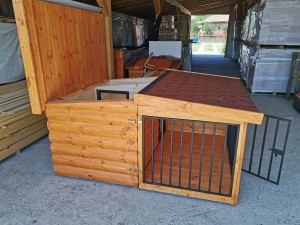 Masszív, rönkhatású borítás, teljes körű szigetelés és zárható fémrácsos terasz – ez a modell mindent tud, amit egy modern, jól átgondolt kutyaháznak tudnia kell.
