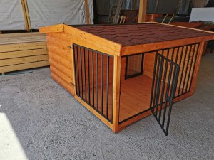 A modell egy teljes értékű, hőszigetelt kutyaházat kombinál egy fedett, zárható fémrácsos terasszal, amely alkalmas pihenésre vagy rövid idejű elkülönítésre.