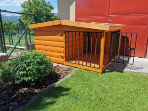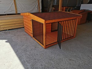 A modell egy teljes értékű, hőszigetelt kutyaházat kombinál egy fedett, zárható fémrácsos terasszal, amely alkalmas pihenésre vagy rövid idejű elkülönítésre.