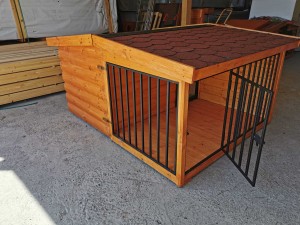 A modell egy teljes értékű, hőszigetelt kutyaházat kombinál egy fedett, zárható fémrácsos terasszal, amely alkalmas pihenésre vagy rövid idejű elkülönítésre.